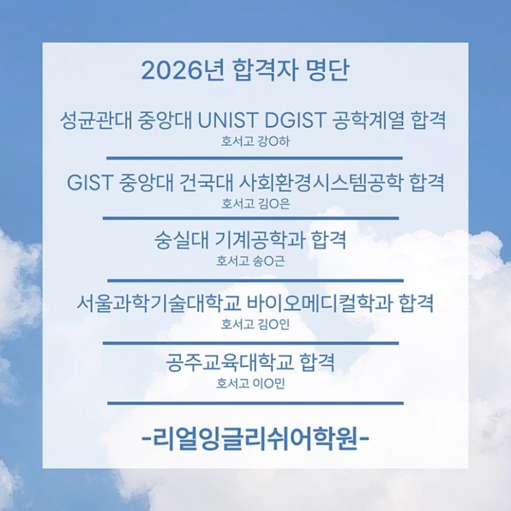 2026년 리얼잉글리쉬 학생들의 합격을 축하합니다! (성균관대/중앙대/건국대/UNIST/DGIST/GIST/숭실대/서울과기대/공주교대 등) Feat.호서고 영어 과목 전교 1등
