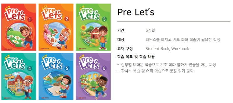 New Pre Let's 과정, 우리 아이의 영어 실력을 한 단계 업그레이드하세요! 안녕하세요, 학부모님! 파닉스를 마친 우리 아이, 이제 다음 단계로 무엇을 해야 할까 고민되시죠? 오늘은 저희 EiE 학원의 New Pre Let's 과정에 대해 교재와 커리큘럼을 중심으로 자세히 소개해드리려고 합니다. New Pre Let's, 이런 과정이에요! New Pre Let's는 파닉스를 마치고 기초 회화 학습이 필요한 아이들을 위한 과정입니다. 교재 구성: 총 6권의 체계적인 학습 과정 New Pre Let's는 총 6권으로 구성되어 있어요. 각 권마다 Student Book과 Workbook이 세트로 제공되며, 약 6개월 동안 진행됩니다. 각 교재는 서로 다른....... <img src="https://blogthumb.pstatic.net/MjAyNjAyMTFfMjYy/MDAxNzcwNzk4ODg2NzI1.JiAa0iENzIn9abGQ6MsHS68khmn-qkof3gdF5VjKVPwg.iMmWXyz_TbYtPeE-alt-UgtavhS_cXPlF8vQ4P53Kq4g.JPEG/%C3%D1%BB%E7%C1%F8.jpg?type=s3" />