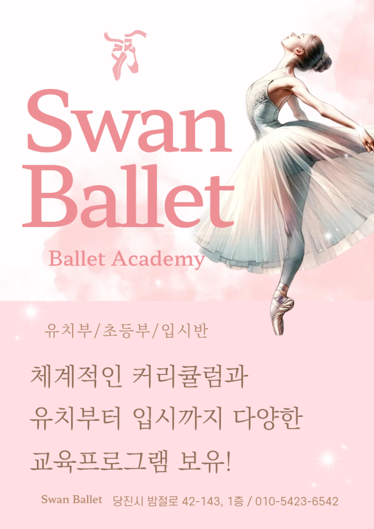2026년 3월 새학기 모집 ✔️️ 새학기 3월 시작! 이미 마감된 반도 있으니 미리 연락 주세요~ 스완 유아발레 월수 3:40 월수 4:40 화목 4:40 월 5:35 금 3:40 금 4:40 토 10:00 스완 초등부 월수 2:40 화목 3:40 화수목 5:40 토 10:50 토 11:50 스완 전공반 (예중•예고 입시반) 월화수목 6:40-8:40 금, 토 / 개인레슨 스완발레무용학원 2년 연속 예중•예고 합격 -계원예중, 국립전통예고, 충남예고 합격!! 제9회 정기공연 / 스완발레무용학원 2/20(금) PM 3:30 당진문예의전당 소공연장 스완발레무용학원 개원 12년 차 9번째 공연입니다. 코로나 2년을 제외하고 해마다 열심히 준비하고 있습니다. 이....... <img src="https://blogthumb.pstatic.net/MjAyNjAyMTFfMjYz/MDAxNzcwNzM4ODQ5NTk1.GUD_2zbaCRCdjicQZ93N1CLLj4PaiGvvoE_jttgp5Qcg.ax7h_B135WKURNTX1_Xz58H6Yf5txFTQuleV4flqrEsg.PNG/IMG%A3%DF2856.PNG?type=s3" />
