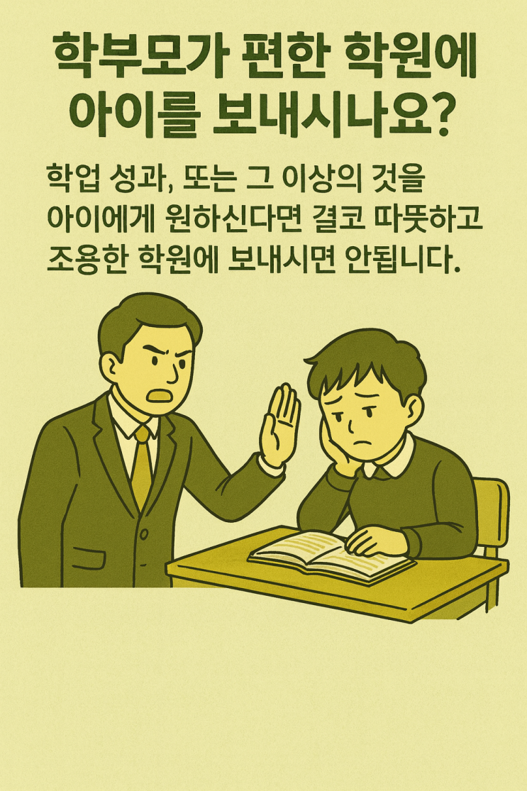 혹시 아이에게 편한 학원에 보내고 계신가요? 아니면 부모님께 편한 학원인가요? 많은 부모님들이 당신에게 없었던 학업성과, 혹은 그 이상의 성취를 아이에게 기대합니다. 그렇다면 절대!! 따뜻하고 조용한 공간만 제공하는 학원을 선택하시면 안 됩니다. 교육학자 앤절라 더크워스는 “성공을 결정짓는 건 재능이 아니라 끈기(Grit)”라고 말했습니다. 아이가 조금 힘들다고 징징거릴 때, 그 순간을 이겨내는 경험이 실력을 쌓는 과정입니다. 학원도 원석을 보석으로 만들기 위해 보석세공사의 마음으로 정성 어린 훈련과 엄격한 관리가 필요합니다. 하루 한 시간 앉아 있는 것으로 수업이 끝나고, 숙제 검사가 대충 이루어지며, 상담 시간은 아....... <img src="https://blogthumb.pstatic.net/MjAyNTEyMDZfODMg/MDAxNzY1MDI0MDYzMTY0.5BLT3R8DY4UWGIPfZr6TJX_Bledf6FWgsxqpz8ZImO0g.SO9zTLRSUmRPGtYsTCLcK8ZVyzeGPOzNtdesBGXndvwg.PNG/c81ae0e9-5bb0-4a0a-8cdc-c135df302add.png?type=s3" />
