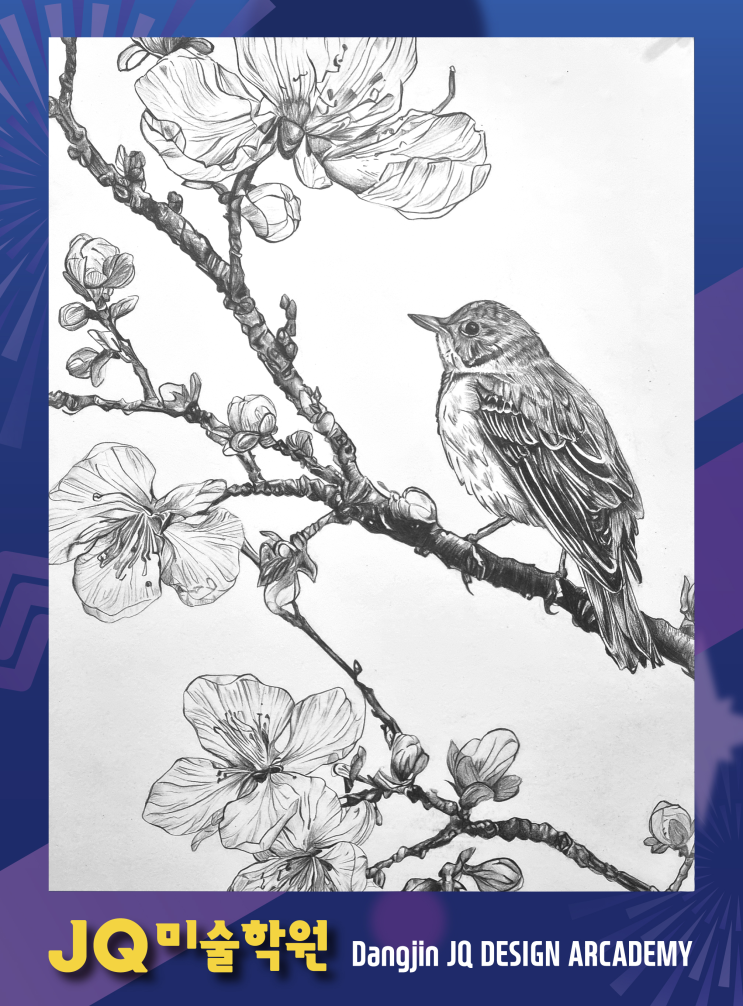 안녕하세요~! 당진 미술학원의 중심! JQ미술학원 중학반입니다~ 2025년이가고 2026년이 찾아왔습니다~!! 새해에는 새해에 걸맞는 깨끗한 마음가짐을 위해! 깔끔한 그림들을 소개해볼까 합니다. 첫번째 작품은 나비와 꽃 드로잉입니다. 나비와 꽃이 좌우로 균형을 이루고 있는 형태여서 좌우대칭을 맞춰야지 이쁘게 보이는 그림인데요. 실수로 종이의 뒷면에 진행했음에도 불구하고 깔끔하게 완성해냈답니다~ 두번째 작품은 꽃이 가득핀 가지위에 앉은 새를 표현한 작품인데요. 표현할 꽃들이 많고, 제각기 다른 방향으로 피어있어서 번거롭고, 평소에 새와 같은 동물을 그릴 기회가 거의 없기때문에 새를 그릴때 형태적으로 다가가기 어려울수 있....... <img src="https://blogthumb.pstatic.net/MjAyNjAxMDJfMjk2/MDAxNzY3MzU4MTA3MjYw.6Wv2D1B245Y2fNxSn_uWdnWVzuDiS4H72A0_mGlvSHMg.aUX8k8di7_hzqetWW4LdBTAwEadVeDJv94tPoAp4xfMg.PNG/JQ_%BA%ED%B7%CE%B1%D7_%BC%BC%B7%CE22.png?type=s3" />
