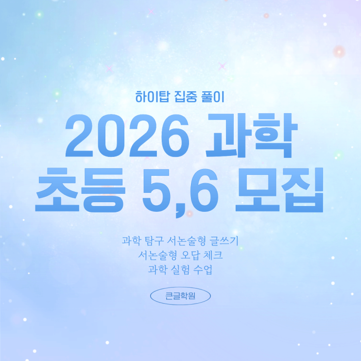 과학, 초등 5.6학년 대상 정규 수업 회원 모집합니다. 과학 탐구 서·논술형 글쓰기 + 과학 실험 수업입니다. 실험을 통해 과학 개념을 이해하고, 탐구 과정을 바탕으로 서술형·논술형 글쓰기를 연습합니다. 탐구·실험 수업, 서술형 오답 정리로 내신 서·논술형을 체계적으로 준비합니다. *교재비 별도 신청 문의 채팅 상담 : 카카오톡에 [큰글학원] 전화 상담 : 02-926-1109 방문 상담 : 서울 성북구 종암로22길 15 2~3층 <img src="https://blogthumb.pstatic.net/MjAyNjAxMDVfMTAg/MDAxNzY3NjAyNjY0Njk1.5J_BuDiouBTo4NogRU8aN1SVtdB0xCLKAP8QFAdVdjYg.Pi3SfqS2TVc0N_qC1aF0ACyRguOiUXkUdsi3rxWdlU0g.PNG/%C5%AB%B1%DB-%C7%CF%C0%CC%C5%BE.png?type=s3" />
