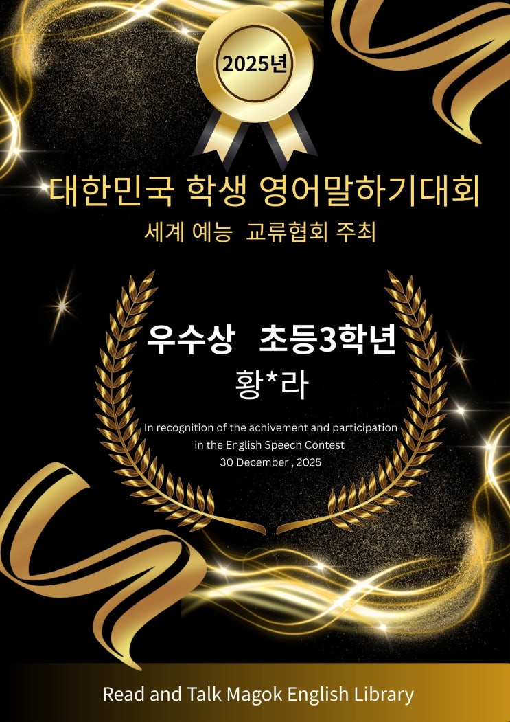 안녕하세요, 리드앤톡마곡 영어 도서학원입니다 12월이 시작된 지 얼마 되지 않은 것 같은데, 추운 날들의 연속입니다~ 이제 정말 겨울이네요~ 이 추운 계절 속에서 학원에 큰 기쁨을 전해주는 소식이 있어 소개드립니다. ♥ 세계예능 교류협회 주관 대한민국 영어말하기대회 참가 지난 11월 30일 일요일, 우리 리드앤톡마곡 학생들이 세계예능 교류협회가 주최하는 대한민국 영어말하기대회에 참여했습니다. 세계예능 교류협회는 1990년 설립 후 30여 년 동안 대한민국의 문화·예술을 세계에 알리고 국제 교류를 촉진해 온 공신력 있는 단체입니다. 영어 말하기, 무용, 음악, 미술 등 다양한 경연을 통해 인재를 발굴하고, 글로벌 리더 역량을 강....... <img src="https://blogthumb.pstatic.net/MjAyNTEyMDlfMTQ3/MDAxNzY1MjU2ODI1NDI5.1xR7qj2a9kG1xkWvakkQz4_nBHJJa3ixgTdMtf7-gcsg.RdpGFLCryXfGh8HD5WNGLV8ZPmKdPVK9xuji8a6-bKog.JPEG/Gold_and_Black_Luxury_Congratulations_Graduation_Poster_%282%29.jpg?type=s3" />