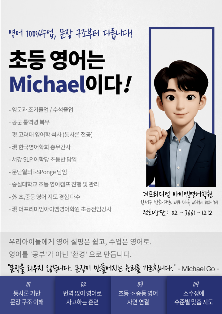 초등 영어, ‘암기’가 아닌 ‘구조’부터 시작해야 합니다 2026 아이엠영어 초등부 모집 안내 초등 시기는 영어 실력의 출발선이자 방향을 결정하는 가장 중요한 시기입니다. 이 시기에 단어 암기와 문제 풀이 위주의 학습으로 시작하면, 중·고등으로 갈수록 영어가 부담이 될 수밖에 없습니다. 아이엠영어는 다릅니다. 문장을 외우게 하지 않고, 문장이 만들어지는 원리를 이해하게 합니다. 초등 영어는 Michael 선생님입니다 아이엠영어 초등부는 Michael 선생님의 체계적인 커리큘럼과 수업 철학을 기반으로 운영됩니다. Michael 선생님 주요 약력 영문과 조기졸업 / 수석졸업 공군 통역병 복무 고려대학교 영어학 석사 (통사론 전공) 한국영....... <img src="https://blogthumb.pstatic.net/MjAyNjAxMjJfMTI2/MDAxNzY5MDYyOTQ3Nzky.9DVJ6mQTjGh3N8zefC6ChrFjmxd763ZBCBp2n9Qzce0g.vd42jOce9hDE1zE9d4VWCSC82DSYMyZYQibq1nFBy1kg.PNG/%C1%A6%B8%F1%C0%BB_%C0%D4%B7%C2%C7%D8%C1%D6%BC%BC%BF%E4._%283%29.png?type=s3" />