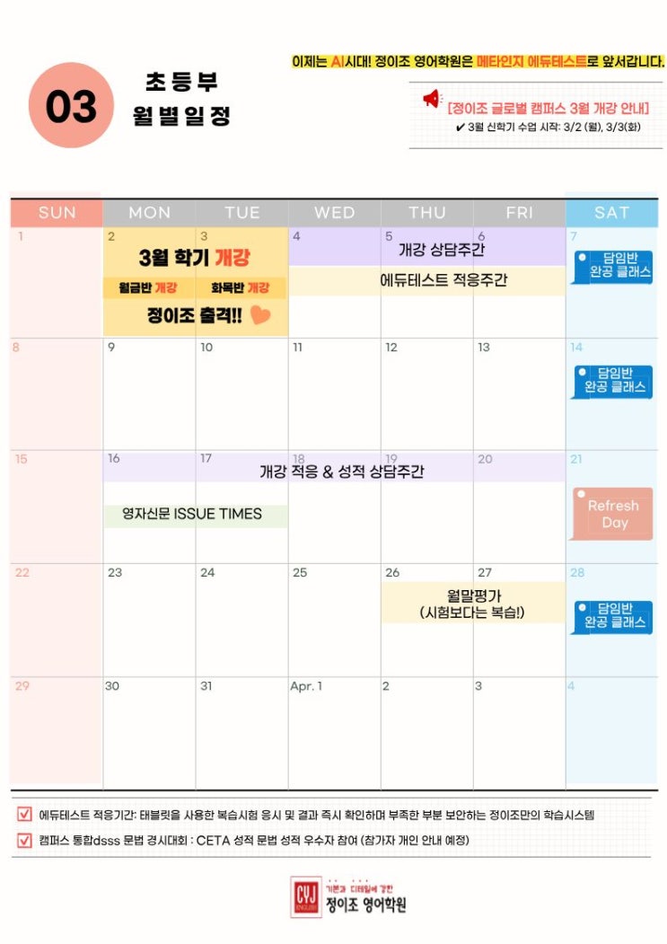 우리 아이들과 학부모님, 학교와 학원 모두 설렘과 기대감 가득한 3월학기 적응을 응원드립니다^^ 2026년 3월학기 대개강 정이조영어학원 글로벌캠퍼스, 힘차게 출격합니다! 새로운 학년이 시작되는 3월은 우리 아이들에게 설렘과 긴장, 그리고 새로운 도전이 시작되는 시기입니다. 학교가 바뀌고, 학년이 올라가고, 학습 환경과 요구 수준도 달라집니다. 이 중요한 출발선에서 정이조영어학원 글로벌캠퍼스는 아이들이 새 학년과 새 학기에 안정적으로 적응하고 학습의 방향을 제대로 잡을 수 있도록 2026년 3월학기를 힘차게 시작합니다. [초등부 3월 월별일정] [중등부 3월 월별일정] “새 학년의 출발선에서, 정이조가 먼저 준비하고 기다립....... <img src="https://blogthumb.pstatic.net/MjAyNjAzMTNfMTgg/MDAxNzczMzc2NDAxNjc4.8aHQZkRcyNHS_p1ptMA5wQ7g7xRFliCu97_tCQ4c7Ukg.LFL430en3EXxJCOjE-m5N9nzRKgYsTUtiMyois9Ui6kg.JPEG/%BF%F9%BA%B0_%C7%D0%BB%E7_%C0%CF%C1%A4.jpg?type=s3" />