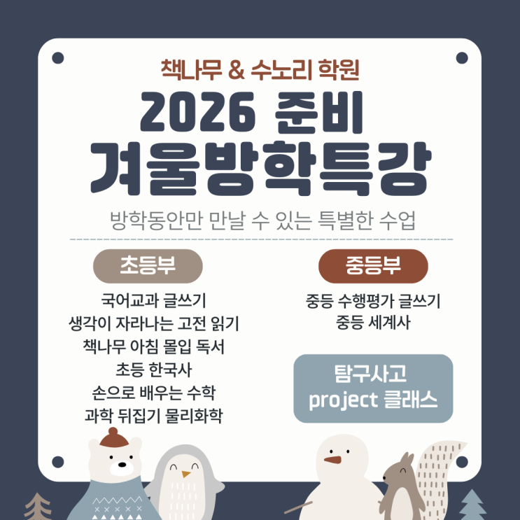 우장산역에서 아이들의 미래에 단단한 거름을 심어주는 책나무&수노리학원이 2026년을 준비하는 겨울방학 특강을 시작합니다. 국어교과 글쓰기(예비 초2~4) 국어 교과에서 글쓰기가 중요한 이유는 명확합니다. 글쓰기는 다양한 자료와 지식을 종합하고, 서로 다른 관점을 비교·분석하며, 자신의 언어로 비판적 사고를 드러내게 하는 최고의 학습 도구이기 때문입니다. 책나무&수노리학원의 겨울방학 국어 교과 글쓰기 특강은 내발산초, 발산초, 우장초 친구들과 함께 1학기 국어 교과서의 핵심 글쓰기 유형을 기반으로 논설문, 설명문, 주장 글, 관찰 기록 등 다양한 글쓰기를 진행합니다. 생각이 자라나는 고전 읽기 (예비 초3~4) 요즘....... <img src="https://blogthumb.pstatic.net/MjAyNTEyMDJfMjYg/MDAxNzY0NjIxMjIyNjQw.O5emoT21QBtDa0mWS08V0PAQ554KasPskrogeNHJ0Zsg.JxF0SSVR3D7GMwP242n9s5yYHLAMTbQD0Z8Xqfhvo2Eg.PNG/%B3%B2%BB%F6%B0%FA_%C8%F2%BB%F6_%B1%CD%BF%A9%BF%EE_%B0%DC%BF%EF_%C4%B3%B8%AF%C5%CD_%B0%A3%B4%DC%C7%D1_%BE%EE%B8%B0%C0%CC_%C7%D0%BF%F8_%B0%DC%BF%EF_%B9%E6%C7%D0_%C6%AF%B0%AD_%BC%F6%B0%AD_%BE%C8%B3%BB_%B0%F8%C1%F6_%C0%CE%BD%BA%C5%B8%B1%D7%B7%A5_%B0%D4%BD%C3%B9%B0.png?type=s3" />