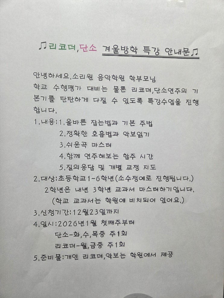 소리원음악학원에서 겨울방학동안 방학 특강반 모집합니다., 악기는 리코더랑 단소입니다. 단소는 소리내기도 어렵고 소리내는 요령이 필요합니다 또한 중학교에서도 배우는 학교가 있어서 필수 입니다. 친구들 불때 우리아이만 멍~~하니 있으면 안되겠죠?? 미리 준비하세요.. #소리원음악학원 #리코더특강 #단소특강 #내발산동음악학원 #수명산파크5단지음악학원 #공진초음악학원 #명덕중학교음악학원 <img src="https://blogthumb.pstatic.net/MjAyNTEyMDlfMjk0/MDAxNzY1MjU4NjgyNjQ1.tjl3iCh-ElgbLM_1sSpEv4vSrqOVtyGaGVynJuO8sZMg.42P8yK3vTwnLH82JPL-GWvWqv2HirIhZdTBijuA7OBwg.JPEG/1000052715.jpg?type=s3" />