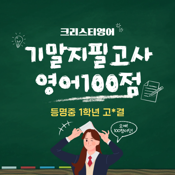 안녕하세요! 크리스티영어입니다. 기쁜 소식을 알리게 되었습니다! 강서구 등명중 1학년 고*결 기말지필고사 100점 소식입니다! 내신준비를 철저하게 한 우리 *결이 고생많았어요! 중간 고사를 보지 않아서 시험 범위가 꽤 많았는데도 잘해주어서 대견해!❤️ 크리스티영어 중등 내신 준비! ✔️ 교과서를 기본으로 어휘, 리딩 지문, 문법 정확한 이해 및 암기 ✔️ 직독 직해 및 영작 완벽 정리 ✔️ 각 영역 문제 풀이 ✔️ 기초 기본 및 심화 문제 풀이 ✔️ 문제 풀이 후 꼼꼼한 오답 관리 열심히 하고 최선을 다하는 친구들이 다니는 크리스티영어! 영어 잘하고 싶은 초중등 친구들 크리쌤에게 오세요!^^ 2026년 크리스티영어....... <img src="https://blogthumb.pstatic.net/MjAyNTEyMDlfMTI2/MDAxNzY1Mjg5NzI5MDM1.gHwI-VFUNsyAL6vUB_BTWpYabf9UZx4wWRIdWyWMPhkg.Yd3yS7idx6qt1CVftiZzi420X7duCdjcYkpJ7uloS8og.PNG/900%A3%DF%C3%CA%B7%CF_%C0%CF%B7%AF%BD%BA%C6%AE%B7%B9%C0%CC%BC%C7_%BD%C3%C7%E8_%BE%C8%B3%BB_%C0%CE%BD%BA%C5%B8%B1%D7%B7%A5_%C6%F7%BD%BA%C6%AE%A3%DF20251202%A3%DF222418%A3%DF0000.png?type=s3" />
