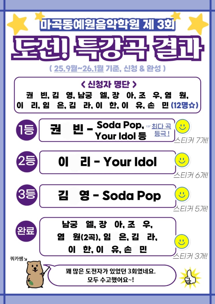 안 녕 하 세 요 ! 강서구 마곡동 공진초등학교와 굉장히 가까운 곳에 위치한 마곡 최고 활력넘치는 음악학원 •• 마곡동예원음악학원 이에요. 오늘은 !! 지난 25년 9월부터 26년 1월까지 치렀던 《 제3회 특강곡 랭킹 결과 》 를 들고 왔어요. 여름부터 시작된 케이팝 데몬 헌터스의 인기로 그 어느때보다도 뜨거웠던 3회였는데요. 어떤 결과가 나왔는지 같이 알아보시죠. ( 색을 바꿔봤어요.. ) 와! 이번에는 무려 도전자가 12명이었어요 !! 역시 케데헌.. 워낙 좋은 곡들이 많았어서 우리 예둥이들이 다양하게 배울 수 있었던 기회였던 것 같아요. 심지어 1등한 친구는 저 두 곡 외에도 더 많이 배웠다고 하니, 그 열정....... <img src="https://blogthumb.pstatic.net/MjAyNjAyMTJfMTE1/MDAxNzcwODc0NDk3MTU1.Vr7LD4GPdBzYuBH0lSYxpxEhcMh7vBEU7eBrlFT0V-Ug.ktNAsqnL4jjUa7xHOkgZVaJiOKOKBsp2QKSTVBFMSdgg.JPEG/900%A3%DF003.jpg?type=s3" />