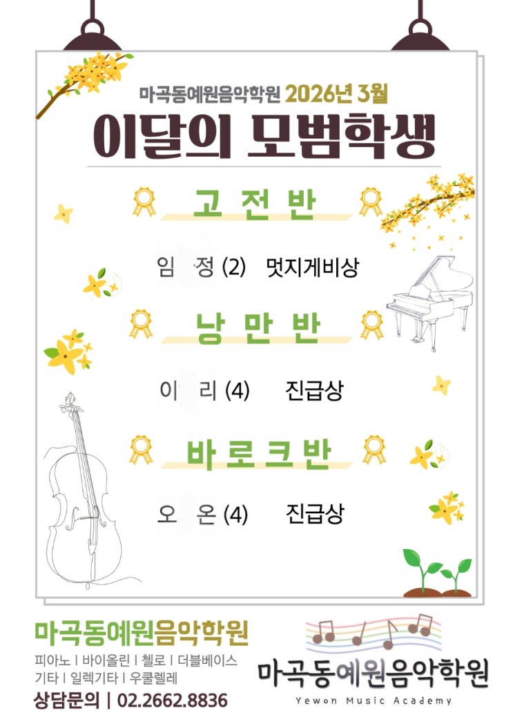 마곡동예원음악학원《2026, 3월의 모범학생》