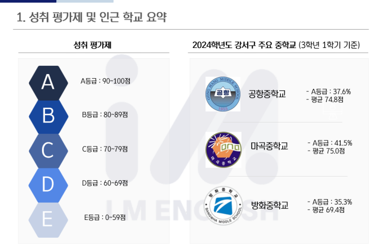 안녕하세요, 아이엠 영어학원 입니다. 오늘은 공항중학교의 내신평가 방식을 분석해보았습니다. 강서구 중학교 내신 구조는 학교별 특성과 평가 방식에 따라 학업 성취 결과가 뚜렷하게 달라지는 경향을 보입니다. 특히 공항중학교는 성취평가제 기반의 절대평가를 적용하면서도 실제 성취도 분포에서 특정 패턴이 반복적으로 나타나는 학교로, 체계적인 분석을 통해 효과적인 학습 전략을 수립할 수 있습니다. 본 글에서는 제공된 2024학년도 성취도 자료와 2025학년도 평가계획을 바탕으로 공항중학교의 내신 구조를 전문적으로 정리하였습니다. 1. 성취평가제 기본 체계 서울 중학교에서는 A~E 등급으로 나누는 5단계 성취평가제를 적용합니다....... <img src="https://blogthumb.pstatic.net/MjAyNTExMjhfMjM2/MDAxNzY0MzE5NzI3OTkx.FrfRA6AhgqnEytQEpQEK4Rs6Vb4EuDehn-NJDwOicNgg.-yXCUXpsolP6zMmYdHD89V0iLcUkA0jrDhltPI5jdDYg.PNG/image.png?type=s3" />