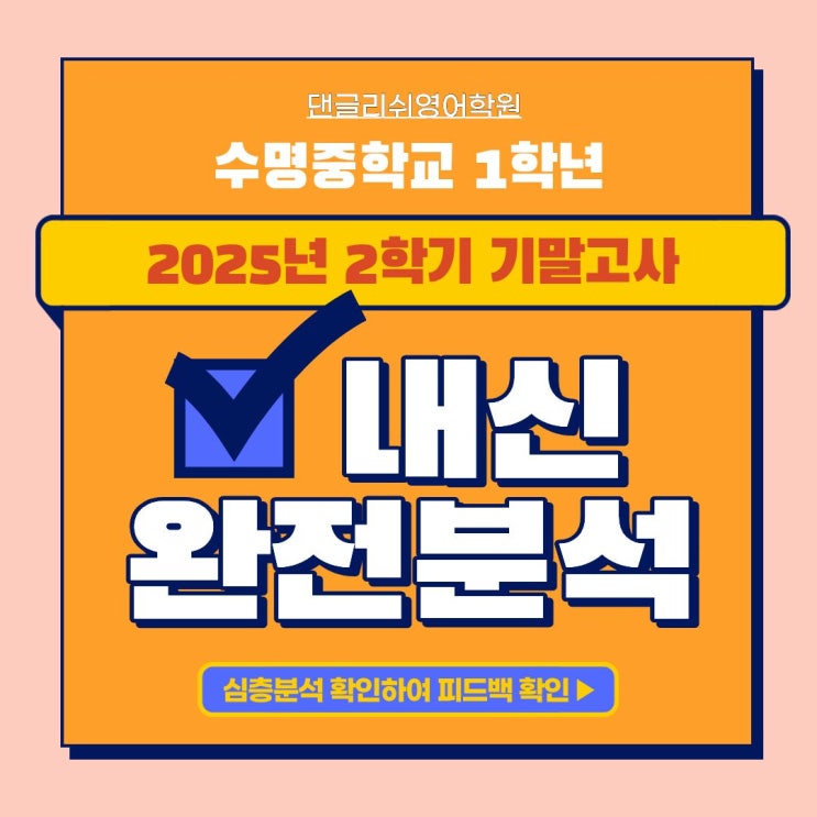 안녕하세요! 댄글리쉬 영어학원 입니다. 이번 2025년 수명중학교 1학년 2학기 기말고사 영어시험은 전체 시험지 4쪽을 전부 살펴보면 “교과서 기반 + 서술형 강세 + 문맥 판단 중심”이라는 수명중 고유의 출제 스타일이 그대로 드러나는 시험이었습니다. 학생들이 “풀 만한데 많이 틀린다”는 느낌을 받을 수밖에 없는 이유가 아주 명확하게 보이네요. 1. 전체 난이도 총평 ⭐ 난이도: 중상 (★★★☆☆ ~ ★★★★☆) ⭐ 예상평균: 60~70점대 ⭐ 특징 요약 문법은 쉽다 하지만 문맥 어법, 대화문 응답, 장문 해석, 서술형 비중 때문에 체감 난이도 상승 길이가 짧은 대신 함정이 많은 구조 즉, “어렵게 만들지 않았는데도 고득점이 어....... <img src="https://blogthumb.pstatic.net/MjAyNTEyMTBfNjEg/MDAxNzY1MzQ5MTYwMDg5.3LfzwB5mtLcebPAGx3hnKWNzEyf7eb6H6oAAY3HBum0g.eIRZGsps4T1WATRdvo2I51oNgTI1tIgm2yClYc0b5mIg.JPEG/%B1%E2%B8%BB%B0%ED%BB%E7%BA%D0%BC%AE%BC%AE.jpg?type=s3" />