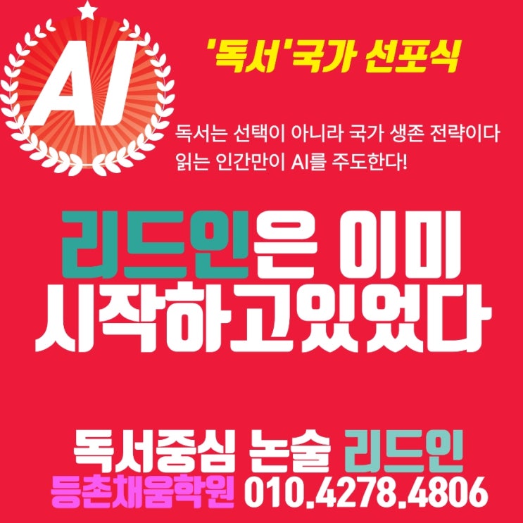 “AI 시대, 독서는 국가 전략입니다" 안녕하세요. 채움학원 리드인입니다. 독서는 더 이상 취미도, 시간 날 때 하는 활동도 아닙니다. AI 시대, 독서는 ‘국가 생존 전략’으로 공식 선언되었습니다. 독서는 곧 국가 경쟁력입니다. 암기와 속도 중심의 교육은 끝났고, 사고력·통찰력·연결력·문제 해결력의 출발점으로 독서가 다시 정의되었습니다. 이 선언은 캠페인이 아닙니다. 정책·제도·예산으로 굳히겠다는 국가의 분명한 방향입니다. 읽지 못하면, 생각할 수 없습니다 국가는 분명히 말했습니다. 읽지 못하면 생각할 수 없고, 생각하지 못하면 AI를 사용할 수는 있어도 결코 주도할 수는 없다는 사실을. 요즘은 명령만 내리면 AI가....... <img src="https://blogthumb.pstatic.net/MjAyNjAyMDNfNDIg/MDAxNzcwMDkyNzU5MTkx.dfVYqXz3w2Z9dKptStHdC0ACqfVYQBlF-qa0TxpYekMg.Lyob8EOQSem4bsv_7RkQ0eyNTT-JhyL83_ImYcHaiVIg.JPEG/900%A3%DF1770092344980.jpg?type=s3" />