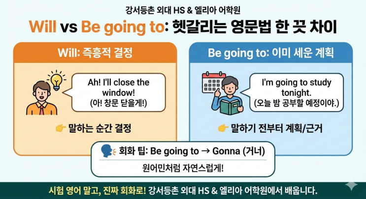 헷갈리는 영문법 한 끗 차이 Will vs Be going to, 아직도 헷갈리니? 영어 공부를 오래 했는데도 막상 말하려고 하면 이런 생각 들지 않나요? “어… 이거 will이야? 아니면 be going to…?” 시험에서는 대충 구분해서 풀었는데 실제 회화에선 입이 자꾸 멈추는 이유, 바로 이 둘의 쓰임 차이 때문입니다. 강서등촌 외대 HS & 엘리아 어학원에서는 이런 ‘시험 영어 vs 말하는 영어’의 간극을 정확히 짚어주는 수업을 합니다. 1️⃣ Will – 지금 이 순간 떠오른 생각 Will은 말하는 순간 결정한 것 즉흥적인 반응일 때 쓰입니다. ✔ 이런 상황! 누가 부탁했을 때 갑자기 결심했을 때 바로 떠오른 생각을 말할 때 회화 예문....... <img src="https://blogthumb.pstatic.net/MjAyNjAxMjZfMTIx/MDAxNzY5NDIyODE1NTYz.bo7vEVRdiFiZzzxZutqodozdrkdcsWD7OLmeacvLc_Qg.Nv-1Yo-kqYK8Jw_O-5hQAetB8jO8qDg1a0dyomrjmaog.PNG/KakaoTalk_20260126_175919514.png?type=s3" />