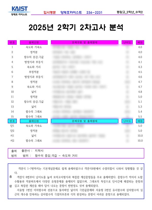 동암고 2학년 2학기 2차고사 수학2분석 전주 중★고등수학 상위권의 표본인 전주 수학학원 양재호카이스트학원입니다. 이번에는 전주 동암고 2학년의 수학2, 2025년 2학기 2차고사를 분석하여 보겠습니다. 위의 내용 중 난이도는 양재호카이스트학원의 내부자료입니다. 그런 이유로 블로그에서는 모두 공개할 수 없음을 양해바랍니다. 학원에 내원하시면 열람가능합니다. ^^ 중화산동 수학학원 양재호카이스트학원에서는 전주에 있는 중★고등학교의 기출을 항상 분석하고 기록으로 남기고 있습니다. 아직 시험을 보지 않은 학생들에게는 좋은 자료가 되고 또한 내년, 내후년에 후배들에게 많은 도움이 되기도 해서입니다. 그리고 시험직전에 시....... <img src="https://blogthumb.pstatic.net/MjAyNTEyMzFfMTU5/MDAxNzY3MTcxNDk1Njk1.-GMfavXTz4jAWhnUevN6qPWJOJLuD-ll_TY-mIn0Wucg.an4RzXyg9FPuxj9jjPPXySCSu5R4Wvfs3djsuyIi_nMg.JPEG/2025-2%C7%D0%B1%E2_2%C2%F7-%B0%ED2-%B5%BF%BE%CF%B0%ED-%BC%F62.jpg?type=s3" />