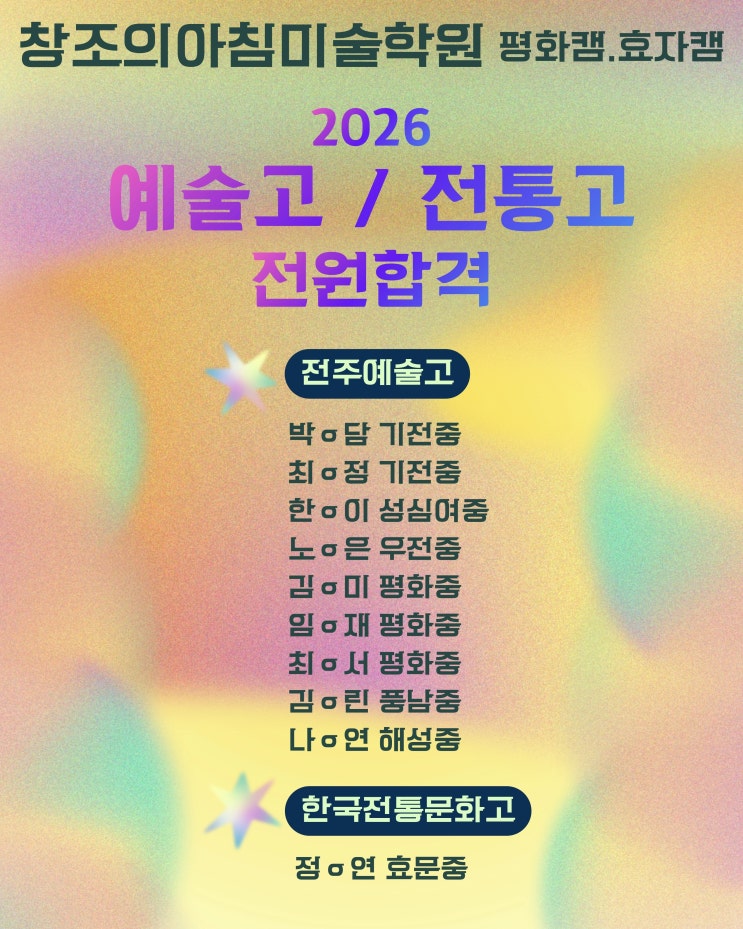 2026 한국전통문화고 & 전주예술고 합격자! 2 년 연 속 전 원 합 격 !!! 올해는 작년보다 예고의 경쟁률이 오를 것으로 예상했었는데요! 예상대로 작년보다 경쟁률이 상승했습니다. 전통고 역시 최근 미술/디자인에 대한 관심이 높아짐에 따라 예고와 마찬가지로 경쟁률이 높았던 상황입니다. 그럼에도 불구하고!! 창조의아침미술학원은 2년 연속 전원합격의 쾌거를 이루어냈습니다! 예고와 전통고는 물론, 인문계를 준비하는 학생들까지 고등 입시만을 바라보지 않고 대입 합격을 바라보며 함께 탄탄히 가르치고 있습니다. 혹시!! 고입은 대입에 비해 중요하지 않다고 생각하시는 분들이 있으실까요? 항상 이야기하는 부분이지만, 고입의 과....... <img src="https://blogthumb.pstatic.net/MjAyNTEyMzFfMjc4/MDAxNzY3MTU1Nzc3ODMw.hYbFBgZrMwNNGwPsO9xzGbfF6Yn5pgR2EGys0i615qsg.wfsLR3NrDQpr9-M1o3-q8-Z3vSImucakBJS4Ema5s5wg.JPEG/KakaoTalk_20251231_132250838_02.jpg?type=s3" />