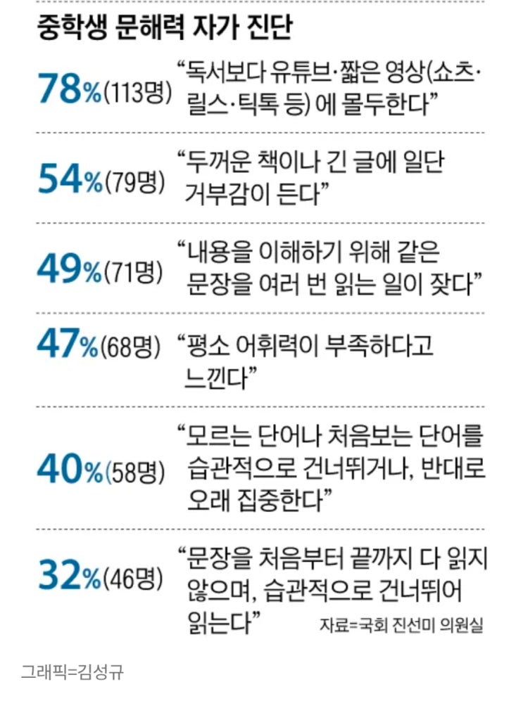 갈수록 아이들의 문해력 저하 문제를 느끼지만 이 기사는 정말 충격이네요. 일부러 못하는 아이들만 골라서 했나? 싶은 결과.. 읽기속도와 문해력을 동일하게 보는 건 아니지만 대부분 책을 많이 읽은 아이들의 읽기 속도가 빠른 건 사실. 물론 빨리 읽었다고 다 이해했으리라 생각하는 것도 금물. 중학생 92%가 1분에 지문 1개 못 읽는다 https://share.google/AIQqSdhlSZ7S70RVx 저희도 아이들의 읽기능력을 확인할 때 시선추적진단테스트를 사용하는데 해보면 위 사진처럼 아이들의 읽는 시선이 보여요. 읽는 시선이 중구난방이고 시선이 오래 머물러서 동그라미가 크면 읽기속도도 느리고 대부분 텍스트 내용도 기억나지 않으니 문제정답률도....... <img src="https://blogthumb.pstatic.net/MjAyNjAyMjVfOSAg/MDAxNzcxOTc0MDk0Njc4.XsSVFJ3u4Vltquc4He12pKIkkjTP2Rtrai4ii2nwIKYg.YzJHJ_h-F4m_bgjILeDhTPCQgRH1nooQBKQLGdUYf1og.JPEG/900%A3%DFScreenshot%A3%DF20260225%A3%DF075659%A3%DFChrome.jpg?type=s3" />