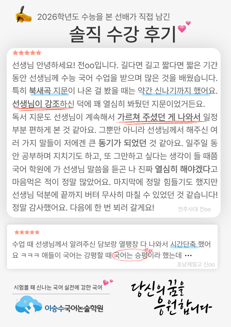 안녕하세요, 이승수국어학원입니다. 2026학년도 수능을 치른 학생들의 생생한 후기를 전해드립니다. 학생은 국어 수업을 통해 실제 시험장에서 자신감 있게 문제를 풀 수 있었다고 합니다. 특히 수업 시간에 강조했던 지문과 독서 영역이 그대로 출제되어, 훨씬 편안하게 접근할 수 있었다고 하네요. 무엇보다도 학원에서 들었던 여러 격려와 조언이 큰 힘이 되어, 끝까지 포기하지 않고 버틸 수 있었다는 이야기를 전해주었습니다. 저희 학원은 단순히 문제 풀이에 그치지 않습니다. 출제 가능성이 높은 지문을 선별해 집중 학습 독서·문학 전 영역을 체계적으로 대비 학생 개개인에게 동기를 주는 맞춤형 지도 이를 바탕으로 학생들이 시험장에....... <img src="https://blogthumb.pstatic.net/MjAyNTExMjhfMzgg/MDAxNzY0MzM3ODA3Mjk5.xQx4HoU0W78FGQRxhPYW8Gn88Mkp8q2jFLSBVViU_xkg.thE-3U3qmFy0SFGFsoum7V5OaSeytUcLlVIal5R8kOQg.PNG/수강후기_전민서,신현욱.png?type=s3" />