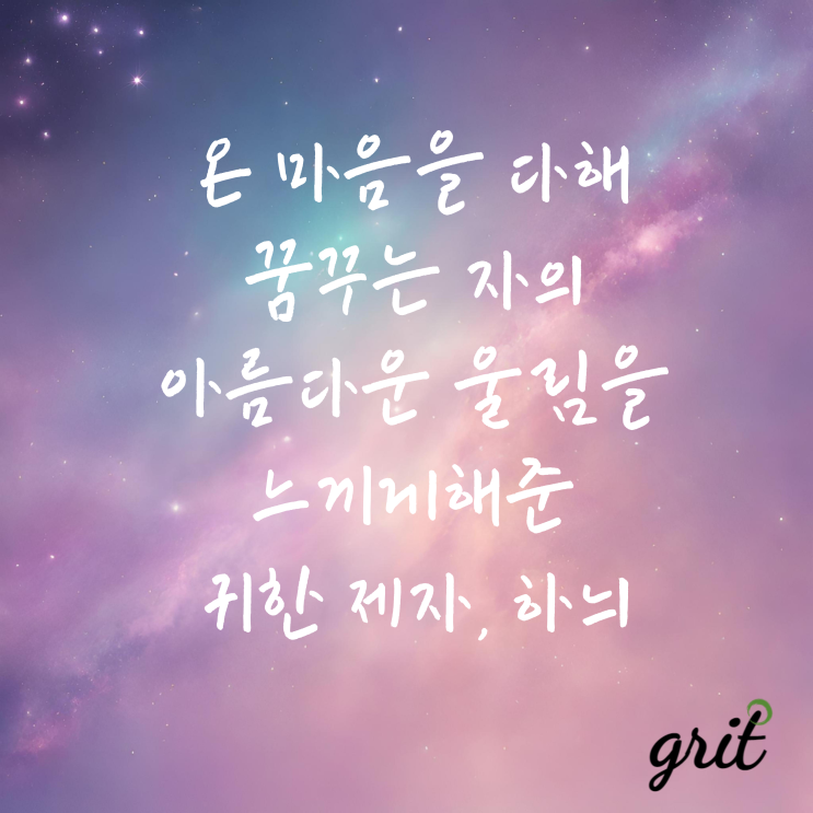 선생님들이 가장 이상적으로 생각하는 수험생의 모습으로 온 마음을 다해 꿈꾸는 자의 아름다운 울림을 느끼게 해준 귀한 제자, 하늬 "강은 원천에서, 하구에서, 폭포에서, 나룻터에서, 바다에서, 산에서, 도처에 어디에서나 동시에 존재하고 있고 동시에 강에게는 현재만이 존재할 뿐이지요" 한의사를 꿈꾸기 전의 시간과, 한의사가 되기 위해 함께 공부한 시간, 그리고 앞으로의 모든 나날들이 진정성을 지닌 한의사로 거듭나기 위한 오롯한 과정들임을 잘 알고 있습니다 하늬가 그릿 선생님들에게 감사함을 느끼는 만큼 선생님들 또한 소중하고 감사함을 느낍니다 고맙고 고마워요 안녕하세요, 저는 2025년 2월부터 수능 전날까지 목....... <img src="https://blogthumb.pstatic.net/MjAyNjAyMjdfMjM5/MDAxNzcyMTY4MzgwMDgz.qIfvDXjIlZ8q8ePLtsdvWCiAlxcMiWuOaSeQM1fLcRAg.w0yNzDd0GcFKGbjVBG7cGP3OFEtTklIrkIq84vze6RQg.PNG/KakaoTalk_20260226_181313104.png?type=s3" />