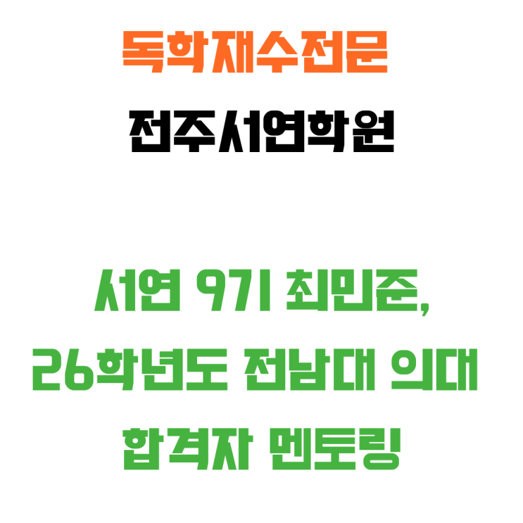 안녕하세요 #전주재수학원 #전주독학재수학원 #전주서연학원 입니다 이번에 전남대 의대에 합격한 서연 9기 최민준 학생이 수험생들에게 전해주고 싶은 이야기를 듣는 멘토링 시간을 마련했습니다. 일시 : 1월 31일 오후 2시 ~ 5시 장소 : 전주서연학원 강의실 대상 : 전주서연학원 재원생 멘토링 순서 2시 ~ 2시 50분 : 강연 3시 ~ 5시 : 1:1 질문 패자부활전의 패자부활전에서 살아 남고 고난을 이겨내어 전남대 의대에 합격한 학생인만큼 지금 수험생들에게 지혜와 용기가 될 소중한 이야기들을 많이 나눌 수 있는 좋은 시간이 될 것 같습니다. 전주서연학원생들도 이 멘토링을 통해서 큰 동기부여를 받기를 바라봅니다 <img src="https://blogthumb.pstatic.net/MjAyNjAxMjNfMjU4/MDAxNzY5MTUwNTA1NjYy.2JbDAXmN8Fh8v5Yr_-ZPTGizyqRhbOHnyIkUecJKUdgg.wJOf62yo4OFft1kvzWrwQ-IJ1x4_9KesBuU-8zpuvz0g.PNG/Never_give_up_instagram_post__%2818%29.png?type=s3" />