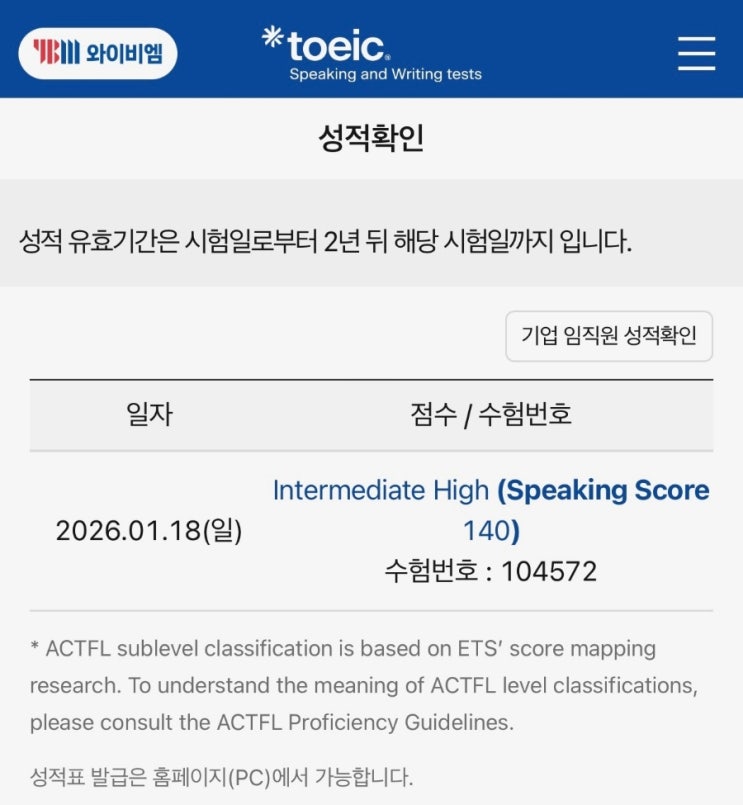 [토익스피킹]2026년 1월 18일 성적발표 1주-IH 140점 <사가정역-중랑구 면목동 토익영어학원>