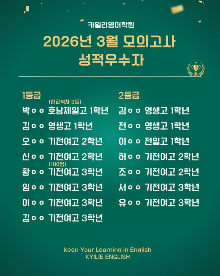 안녕하세요 카일리영어학원입니다. 이번 3월 모의고사에서도 고등부 친구들은 우수한 성적을 보여줬습니다! (시험보느라 모두들 고생많았습니다) 꾸준한 노력과 성실한 태도는 결국 좋은 결과를 가져옵니다. 어려운 문제도 끝까지 집중하여 실력 발휘한 친구들! 그동안의 학습 과정이 올바른 방향으로 이루어지고 있음을 보여주는듯 합니다. 앞으로도 현재에 안주하지 않고 부족한 부분을 보완하며 더욱 성장해 나가길 바라며, 모든 카일리 친구들의 가능성을 믿고 목표를 향해 나아갈 수 있도록 끝까지 함께 하겠습니다. Keep Your Learning In English! 문학초, 홍산초, 기전중, 기전여고에서 5분거리에 위치해 있으며 자세한 교육 문의 및 상....... <img src="https://blogthumb.pstatic.net/MjAyNjA0MDJfMiAg/MDAxNzc1MDYwMjIwMDUz.g1TSboX_N_-6f2rZTLkw65KzMt5Zlgatu9GmvNPs3I0g._cVRVSYnr3eXdAEvElBGr7hTk8iTxD2HDtUiHW-bhZsg.JPEG/Design_2.jpg?type=s3" />