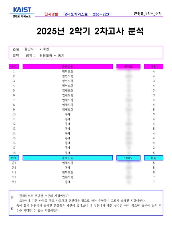 근영중 1학년 2학기 2차고사 수학분석 전주 중★고등수학 상위권의 표본인 전주 수학학원 양재호카이스트학원입니다. 이번에는 전주 근영중 1학년의 수학, 2025년 2학기 2차고사를 분석하여 보겠습니다. 위의 내용 중 난이도는 양재호카이스트학원의 내부자료입니다. 그런 이유로 블로그에서는 모두 공개할 수 없음을 양해바랍니다. 학원에 내원하시면 열람가능합니다. ^^ 중화산동 수학학원 양재호카이스트학원에서는 전주에 있는 중★고등학교의 기출을 항상 분석하고 기록으로 남기고 있습니다. 아직 시험을 보지 않은 학생들에게는 좋은 자료가 되고 또한 내년, 내후년에 후배들에게 많은 도움이 되기도 해서입니다. 그리고 시험직전에 시중....... <img src="https://blogthumb.pstatic.net/MjAyNjAxMDRfNTEg/MDAxNzY3NTI0OTU3NjM5.aLJJdyObBxan-ZvhYBZ0GPoe1_HVq_ttM5tAQjnU0Kwg.sX-ZC1kLrihjv2oEdoEMO1g9v_vk2lBEUt9ojngWZwYg.JPEG/%B1%D9%BF%B51.jpg?type=s3" />