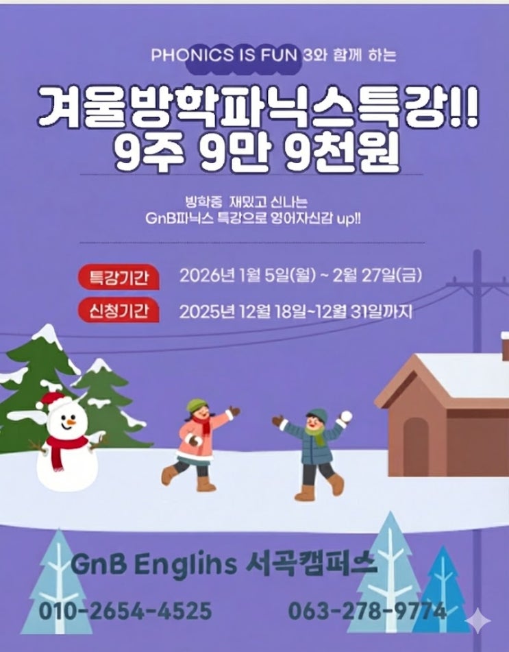 제목: ⛄겨울방학, 우리 아이 영어 자신감! 9주 완성 파닉스 특강으로 시작하세요! 안녕하세요, GnB English 서곡캠퍼스입니다. 다가오는 겨울방학, 영어의 첫걸음인 '파닉스'를 확실하게 잡아줄 특별한 기회를 준비했습니다. ❄️ 이번 겨울, 영어가 즐거워집니다! "영어 단어 읽기를 어려워하나요?" "원어민 발음처럼 자신 있게 말하고 싶은가요?" GnB만의 즐거운 파닉스 수업으로 영어 기초 체력을 튼튼하게 길러주세요. 서곡캠퍼스만의 특별 혜택 9주 과정이 99,000원! (교재비 별도) 부담 없는 가격으로 최고의 영어 교육을 경험해보세요. 특강 안내 기간: 2026년 1월 5일(월) ~ 2월 27일(금) 대상....... <img src="https://blogthumb.pstatic.net/MjAyNTEyMjFfMiAg/MDAxNzY2MzIwMjE5MjA3.4eAETij2KBS25K8b0etIMSf2224-5ebe__o7TDAC7p0g.fc2wsE8bqSYKZMMtHLSz4qDqVVHJBmZyd_Wxszr1jzMg.JPEG/unnamed.jpg?type=s3" />