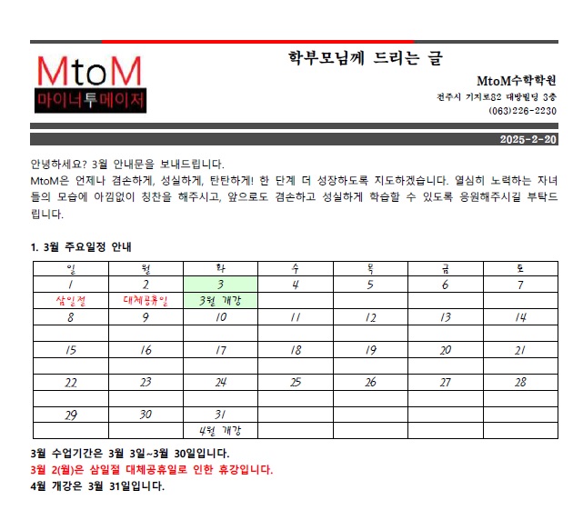 [전주엠투엠수학학원] 3월 안내문