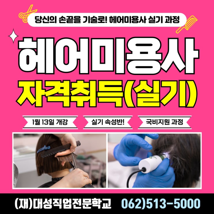 안녕하세요. 대성직업전문학교입니다! 여러분 오늘은 본론으로 바로 넘어가서 헤어미용사 자격취득 실기과정을 알아보려합니다! 혹시 헤어미용사 자격증 취득을 망설이고 계신가요? 빠르고 확실하게 합격하고 싶다면 단 2개월! 헤어미용사 실기 합격, 초고속으로 달성하세요! 헤어미용사 자격취득(실기) 속성과정에서는 어떤걸 배우나요? 이 과정에서는 미용 기기와 제품을 활용하여 두피 모발관리, 헤어샴푸, 콜드펌, 베이직 헤어컬러, 블로우드라이 스타일, 원랭스 헤어커트, 그래쥬에이션 헤어커트, 레이어 헤어커트의 서비스를 고객에게 제공할 수 있는 기술을 배울 수 있습니다! 또한 헤어미용 실기과정을 통해 미용사(일반) 국가기술자격증....... <img src="https://blogthumb.pstatic.net/MjAyNTEyMTBfNTMg/MDAxNzY1MzMzNjk5NzM2.1peorz-kZvAf6tp-C2nvsxYd_gi17D1b1B4HdCsWpk0g.qPa4vG14wccdmZ9QLdNiUBMHhNWCP_3AFZ9uvzSRcHAg.JPEG/%BA%ED%B7%CE%B1%D7%BF%EB-020.jpg?type=s3" />