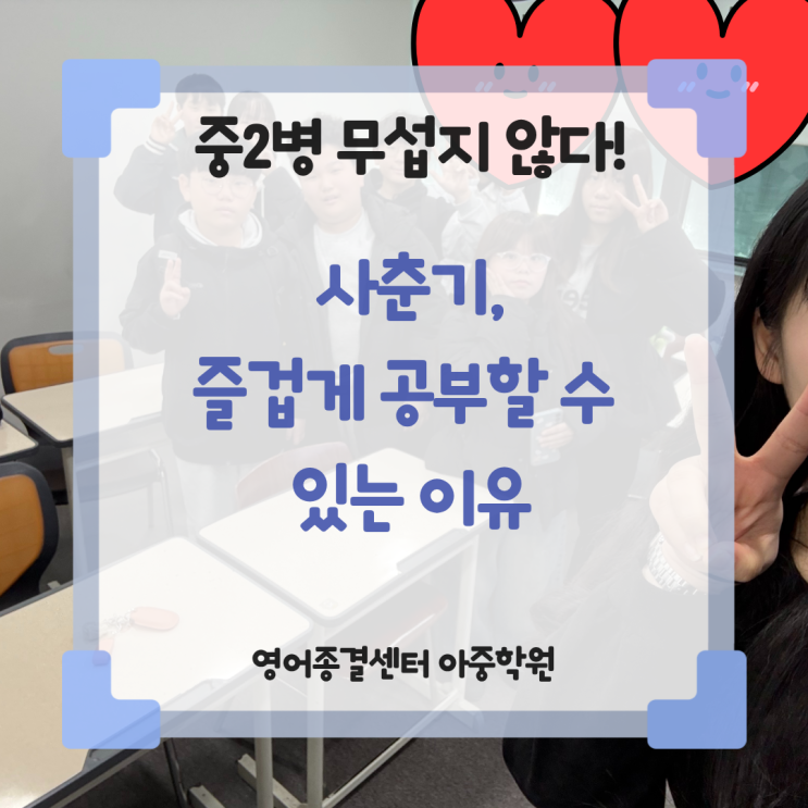 오늘은 아중리 중학생 영어 학원 영종에서 중학생이 된 친구들이 어떻게 공부하면 좋을지 고민을 나누는 시간을 가져보려고 합니다. 모든 연령 중에 가장 어려운 때가 중2라고 하죠. 중2병이라는 말이 괜히 생겨난 말은 아닌 것 같아요. 재원생이나, 신규 입학 상담을 할 때도 '우리 아이가 사춘기라서요..' '중학교 2학년, 너무 어렵네요. 공부도 안 하려고 하고, 제 말도 안 들어요.' 라는 말을 심심치 않게 듣곤 합니다. 사실, 중학교 2학년의 문제라기보다는 빠르게는 초등학교 5학년부터 늦게는 고1까지 계속되는 고민이랍니다. 통틀어서 부를 수 있는 이 사춘기 시기, 영어 공부는 어떻게 해야 할지 우리 영종 쭈니 친....... <img src="https://blogthumb.pstatic.net/MjAyNjAyMDVfMTM0/MDAxNzcwMjgyMjU0Nzk4.aEX6e50zRDCs8TMx9bvQJw8Z8aINrf_8ynqw8iWVUhcg.xHaLSKmsmxrJ8UEKGoaP6imSHpfk7lRzIuIZrLc33yUg.PNG/%BE%C6%C1%DF%B8%AE_%C1%DF%C7%D0%BB%FD_%BF%B5%BE%EE_%C7%D0%BF%F8_%282%29.png?type=s3" />