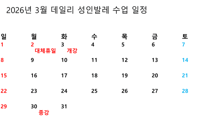 안녕하세요! 전주성인발레전문 데일리발레 3월 수업 일정 및 등록 안내드립니다. 3월 수업 시작은 3일에 개강하여 4주차인 30일에 종강 수업 진행됩니다. 첨부드린 달력 참고해주시고, 별도 궁금 사항은 학원에서 박원장에게 상담 요청하시거나 아래 번호로 문의 주시면 안내드리겠습니다. 기존회원 재등록 안내드립니다. 먼저, 현재 정원이 몰려 있는 수업들의 경우 기한이 지나면 부득이 등록이 제한될 수 밖에 없는 부분 미리 양해 부탁드립니다. 재등록 기간: 2월9일(월)~2월18일(수) 재등록은 기간 안에 학원에서 당담 선생님께 요청하거나 박원장에게 문자나 카톡 주시면 바로 안내드리겠습니다. 연휴 기간에도 온라인으로 등록 가능하니 박....... <img src="https://blogthumb.pstatic.net/MjAyNjAyMDdfNTAg/MDAxNzcwNDI5MTI0MDc2.6hMaQ0I-hQCGKTK0PenvA7kVUrzgxvyfoRgfxDCi6xcg.dhA25nyLzyDSpkF5ckl57LcEYmYJ9IkWGAZOcEzDhoMg.GIF/26%B3%E23%BF%F9.gif?type=s3" />
