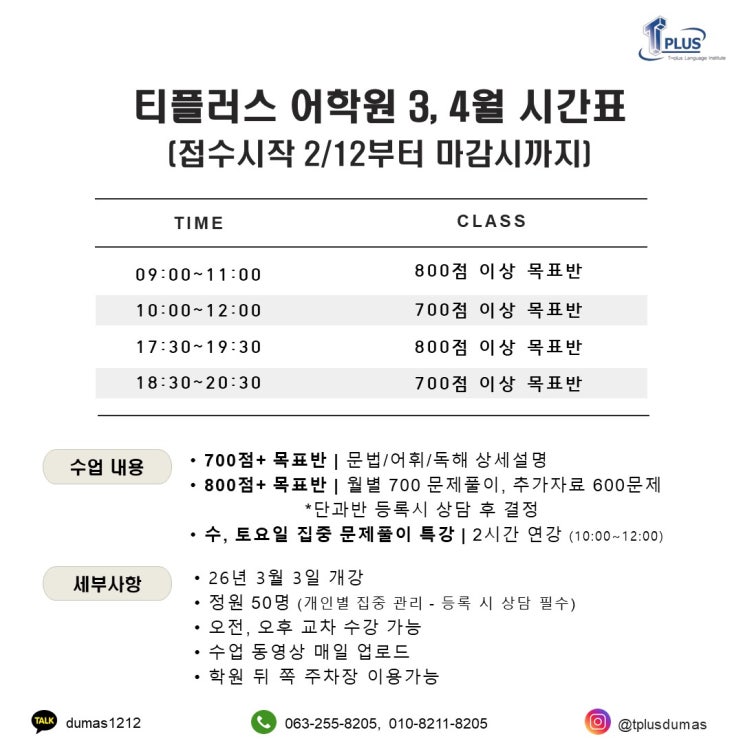 [공지] [개강] 전주 티플러스 어학원 2026년 3월, 4월 시간표 (접수시작 2/12 ~ 마감시까지)