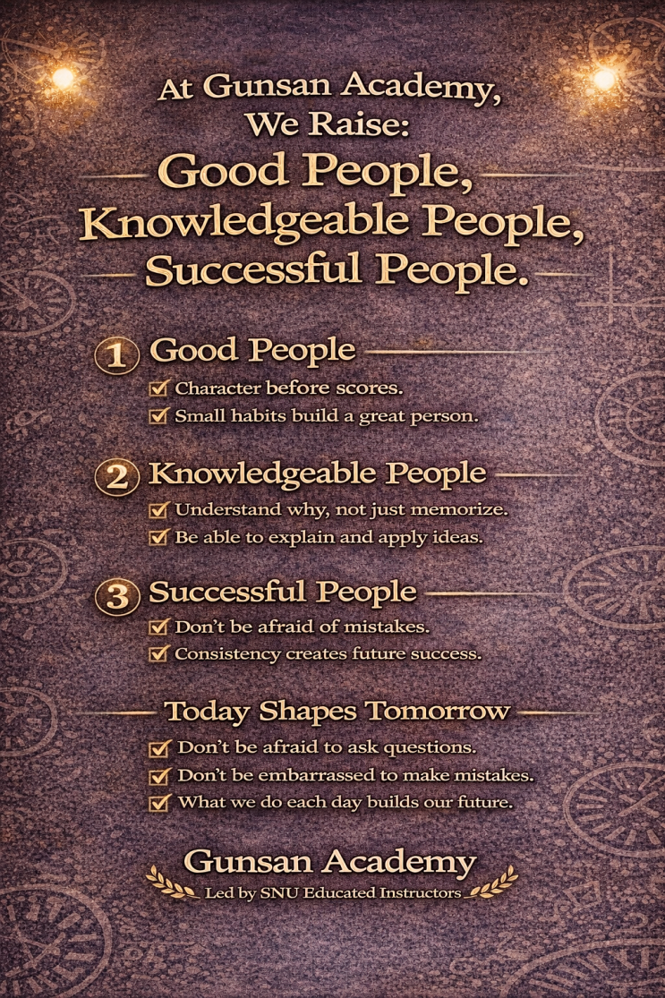 학원을 선택할 때 부모님들은 보통 이렇게 묻습니다. 성적은 얼마나 오르나요? 내신은 잘 나오나요? 몇 등급까지 올려주나요? 물론 중요합니다. 하지만 우리는 조금 더 근본적인 질문을 던집니다. 이 아이를 어떤 사람으로 키울 것인가? Ⅰ. 된 사람 – 예의 바른 사람 아무리 성적이 좋아도 기본이 무너지면 오래 가지 않습니다. 인사는 작은 습관입니다. 시간을 지키는 태도도 습관입니다. 경청하는 자세도 훈련입니다. 공부는 결국 스스로를 관리하는 힘입니다. 된 사람이 되지 못하면 지식은 방향을 잃습니다. Ⅱ. 든 사람 – 머리에 지식이 든 사람 우리는 암기를 목표로 하지 않습니다. 왜 그런지 이해하고 스스로 설명할 수 있고 다른 문....... <img src="https://blogthumb.pstatic.net/MjAyNjAyMjdfMTMg/MDAxNzcyMTc0NzM4NTQy.EgR2mZR9_Ky0O4I60qit3klsue0JE37IavVlfIrfjUQg.Px_u9TjlckBQbDiJ_5cXUepElGyPl5EW4dA0DylxJU0g.PNG/%B5%C8_%BB%E7%B6%F7_%B5%E7%BB%E7%B6%F7_%B3%AD%BB%E7%B6%F7.png?type=s3" />