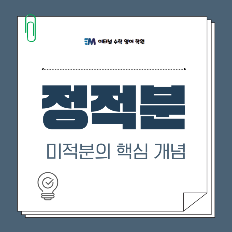 안녕하세요. 미장동 영어학원 이터널 수학 영어 학원입니다. 미적분을 배우다 보면 “왜 적분을 배우는지 모르겠다”는 말을 자주 듣습니다. 하지만 정적분은 단순한 계산 단원이 아니라, 변화량을 해석하는 가장 중요한 도구입니다. 함수의 그래프와 축 사이의 넓이를 구하고, 누적된 값을 계산하며, 속도에서 거리를 구하는 과정까지 모두 정적분으로 연결됩니다. 오늘은 정적분의 개념부터 교육과정, 수능 출제 경향, 학습 전략까지 차분하게 정리해보겠습니다. 1. 정적분의 개념 – 넓이와 누적값의 의미 정적분은 특정 구간에서 함수의 값을 모두 더한 결과를 의미합니다. 쉽게 말해, 그래프 아래의 넓이를 구하는 과정입니다. 정적분은 미....... <img src="https://blogthumb.pstatic.net/MjAyNjAzMDNfMTgy/MDAxNzcyNTAyMDk4NTY0.dbda3YO98m7Q8u0Tjkcq8TyXmYanUneWgsMmT7w8WAQg.f5U-vmZimNam2EqIy7YhMK8sDPizwFcQorhfhYoLJnog.PNG/%C1%A4%C0%FB%BA%D01.png?type=s3" />