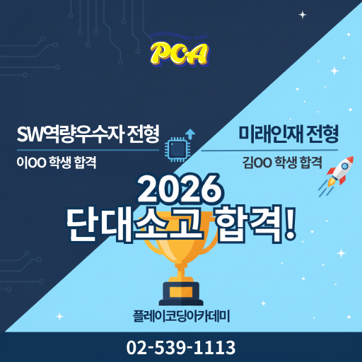 안녕하세요, 고입도 결과로 증명하는 대치동 코딩 입시의 중심, 플레이코딩아카데미입니다. 2026학년도 고입 입시 결과들이 속속 발표되고 있습니다. 치열했던 경쟁 속에서도 플레이코딩아카데미 재원생들이 단국대학교부속소프트웨어고등학교(단대소고, 단소고) 합격이라는 기쁜 소식을 전해왔습니다. 특히 이번 합격이 더욱 의미 있는 이유는, 서로 다른 평가 기준을 가진 'SW역량우수자 전형' 과 '미래인재 전형' 에서 각각 합격생을 배출하며 PCA의 평소 교육철학 및 방향성과 맞춤형 입시 전략이 틀리지 않았음을 증명했음 입니다. 2026학년도 단소고 합격자 명단 2026 단대소고 [SW역량우수자 전형] 합격 이....... <img src="https://blogthumb.pstatic.net/MjAyNTEyMTBfMjc1/MDAxNzY1MzQ5ODQ0OTE5.fuRys93CwxoLT4Yfe8tqWrme7uto9OixWd_ZMEOTTrog.TZK6zohgik1IxliYg6bdvXPGm0ruZyBtSUttKYklmw4g.PNG/2026_%B4%DC%B4%EB%BC%D2%B0%ED_%C7%D5%B0%DD_%BD%E6%B3%D7%C0%CF.png?type=s3" />