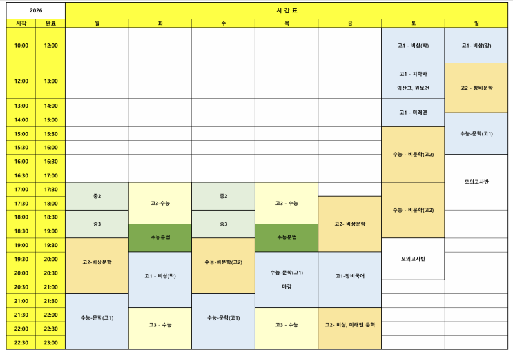 슈룹 국어, 시간표 안내입니다. 현재 모든 반의 자리가 1자리 혹은 2자리 정도만 남은 상태입니다. 3월이 되면 대부분 자리가 마감 될 것으로 보입니다. 많은 분들의 성원에 감사드리며, 가능한 좋은 성적으로 보답 할 수 있도록 신경쓰고 노력하겠습니다. <img src="https://blogthumb.pstatic.net/MjAyNjAyMjdfMTY4/MDAxNzcyMTgxNjcwMzc3.dTcEkjc6hIJgJVxo5UR8j2EiyVmJMQmXo0kO_E-nlJsg.uBAmqF_TI8mirpKT9qm5XX31yrs1JVg6qDHCfq1YjXog.PNG/image.png?type=s3" />