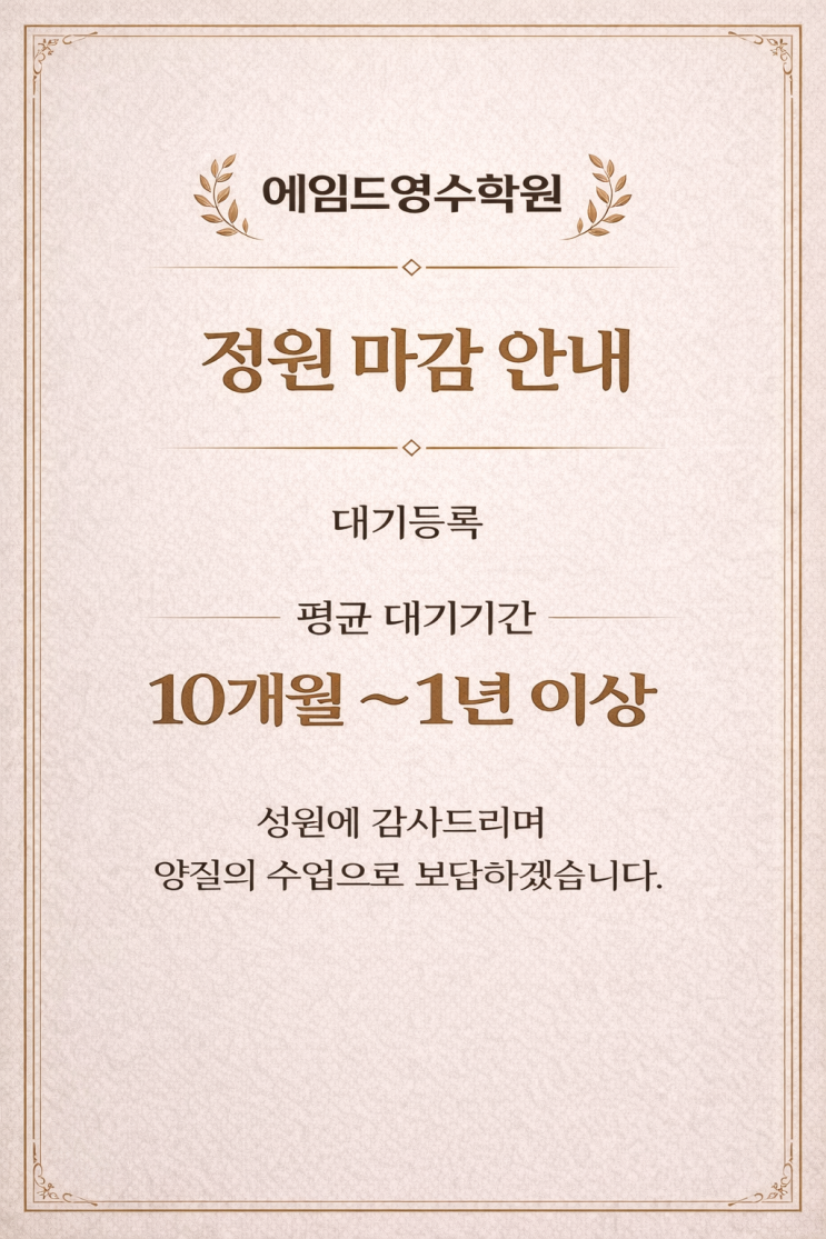 안녕하세요, 에임드학원입니다. 현재 에임드학원은 전 학년 정원이 마감되어 신규 등록은 대기 등록으로만 안내드리고 있습니다. 현재 평균 대기 기간은 약 10개월에서 1년 이상 정도 소요되고 있습니다. 에임드학원은 처음 학원을 시작할 때부터 학생 한 명 한 명에게 충분한 시간과 집중을 투자하는 수업을 가장 중요하게 생각해 왔습니다. 그래서 무리한 정원 확대나 빠른 확장은 하지 않고, 지금의 수업 밀도와 관리 수준을 유지하는 방향을 선택하고 있습니다. 그 과정에서 자연스럽게 대기 기간이 길어지게 되었고, 기다려 주셔야 하는 상황이 되어 늘 송구한 마음입니다. 그럼에도 불구하고 많은 학부모님들께서 에임드학원을 믿고 대기 등....... <img src="https://blogthumb.pstatic.net/MjAyNjAzMDZfMjk2/MDAxNzcyNzc4NjgwNjky.B88DWwFaSjch-1nxxL0mdxDHEaSFmvC5m1W-fCSA8-Yg.RXbWdeIA_5J-zcgX2cADZv7qAM-3cWqmjXc3on1itAkg.PNG/%B4%EB%B1%E2_1%B3%E2%BC%D2%BF%E4.png?type=s3" />
