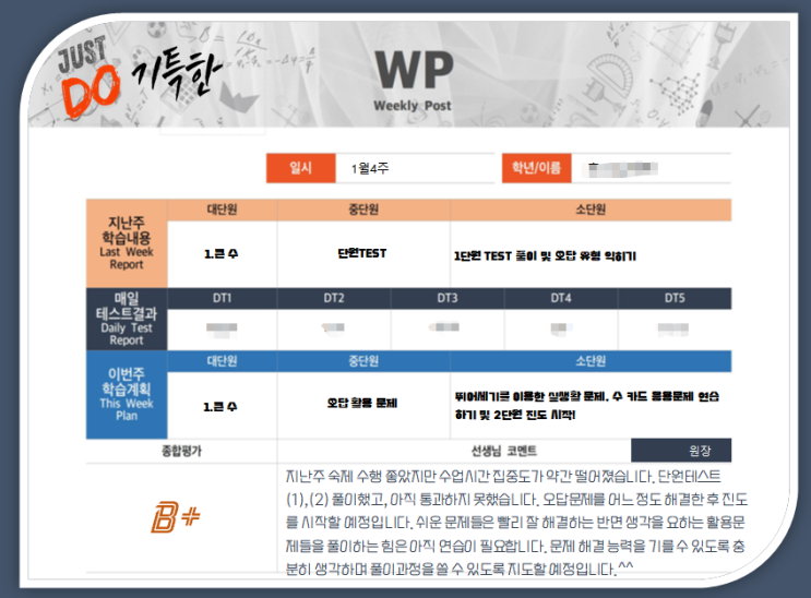 한 주 동안의 수학 학습을 정리한 1월 4주 위클리 포스트입니다. 이번 주는 단원 TEST를 통해 아이의 현재 이해도를 점검하고, 그 결과를 바탕으로 오답 정리에 집중한 시간이었습니다. 지난주 학습 내용 지난주에는 단원별 핵심 개념을 정리한 뒤 단원 테스트를 통해 학습 내용을 점검했습니다. 문제를 풀 때 어떤 유형에서 막히는지 실수인지, 개념 부족인지 풀이 과정이 알맞게 이어지고 있는지 학생 개인별 중점 부분을 살펴봅니다. 단원 테스트 결과 점검 단원 테스트 결과, 기본문제와 반복 유형은 비교적 빠르게 해결하는 반면 생각을 요하는 활용 문제에서는 풀이 과정이 흔들리는 모습이 보입니다. 이는 개념이 완전히 부족하기보다는 문....... <img src="https://blogthumb.pstatic.net/MjAyNjAxMjhfNDgg/MDAxNzY5NTkzMjI0NDg5.uNZATvUFNz9wSUTgRtyZa9b9802VkvZKKRapHgofM3wg.ieDNR1nHV-k4ZTpjDevvOB6vq3iNxCExYjn2qJdz798g.PNG/1%BF%F94%C1%D6%C0%A7%C5%AC%B8%AE.png?type=s3" />