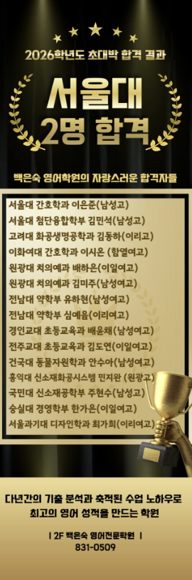 요즘 학원들의 홍보 글을 보다 보면 “○○대 ○명 합격”, “SKY 다수 합격” “1등급 OO명" 이라는 문구가 넘쳐납니다. 하지만 정작 어느 고등학교 출신인지 학생 이름이 무엇인지 1등급을 맞은 학생 숫자가 실제인지 이 세 가지를 모두 공개하는 곳은 많지 않습니다. ❗ 안타깝게도 실제로는 존재하지 않는 합격자, 또는 타 학원·타 지역 학생을 끼워 넣은 허위 명단으로 홍보하는 사례도 적지 않습니다. 백은숙영어학원은 다릅니다 ✔ 모든 합격자는 백은숙 영어학원에 오랫동안 다닌, 졸업 후에도 원장님과 소통을 하는 실제 수강생들이며 ✔ 출신 고등학교 + 대학교 + 학과 + 학생 이름 전부 공개하고 ✔ 학생 또는 학부모 동의 후에....... <img src="https://blogthumb.pstatic.net/MjAyNjAyMDFfMTkg/MDAxNzY5OTMxNTk3MDIw.B0w72xdQh1FT5gUbVL66q2blPt_f2TetZC-owpVcTaAg.g-3FuTvZLJKUq0p2E2KzfDqV64q_gMT_BOW5aLfXuZog.PNG/KakaoTalk_20260201_144952097.png?type=s3" />