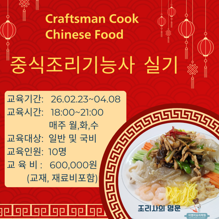 중식조리기능사 실기과정 안내 드립니다. 수업문의: 네이버 톡톡 또는 851-9200 수강신청: https://leecook.kr/ 또는 방문 신청 국민내일배움카드로 수강가능합니다. 실기시험접수: Q-net <img src="https://blogthumb.pstatic.net/MjAyNjAyMDRfMjI3/MDAxNzcwMTg1NDcyMTY2.8PCA0vBXnlH2PqLLf-bgFpnEd5OIC77q0r5Q8Gpw4MQg.PsMgvz-ZlY_Sxa3KDqtEsRwi-7VPkYcafcxT1DKb0Dkg.PNG/Red_Blue_Japanese_Food_Promo_Instagram_Post_%281%29.png?type=s3" />