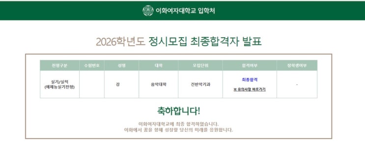 2026년 정시 가군 이화여자대학교 건반악기과 피아노전공 합격!!