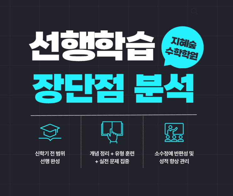안녕하세요 지혜숲 수학학원입니다. 초중고 학생들의 선행학습은 한국 교육 환경에서 가장 뜨거운 감자 중 하나입니다. 단순히 ‘남들보다 빨리 배우는 것’ 이상의 전략적 의미와 부작용이 공존하기 때문이죠. 저희 학원으로 상담을 많이 오시면 자주 묻는 주제이기도 합니다. 잘하면 득이 될 수 있지만 잘못하면 독이 될 수 있는데요 오늘은 선행학습의 장단점을 분석하는 시간을 갖도록 하겠습니다. 선행학습의 장점 먼저 장점부터 알려드리겠습니다. 가장 먼저 떠오르는 건 심리적 안정감과 자신감 형성입니다. 학교 수업을 듣기 전 내용을 미리 알고 있으면, 수업 시간에 더 적극적으로 참여하게 됩니다. "나 이거 알아"라는 자신....... <img src="https://blogthumb.pstatic.net/MjAyNjAxMDNfMjUg/MDAxNzY3Mzk3MDc2MTky.RWrs_EDuX8JY1rRTt2T4OzqW9vzEhM8wm8PpD98SWv0g.WrDlHVA2OidPxvVs81-xYZ1QGNppYrbYKnnj3cXQLUog.PNG/image.png?type=s3" />