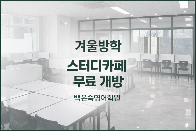 겨울방학 스터디카페 무료 개방 안내 방학 동안, 공부할 공간부터 다릅니다. 겨울방학은 공부 격차가 가장 크게 벌어지는 시기입니다. 집에서는 집중이 어렵고, 스터디카페는 하루하루 비용이 부담되는 것이 현실입니다. 그래서 백은숙영어학원은 방학 동안 학생들이 비용 걱정 없이, 하루 공부 루틴을 무너지지 않게 유지할 수 있도록 학원 내 스터디카페를 전면 무료 개방합니다. ▶ 이런 학생들에게 꼭 필요한 공간입니다 방학만 되면 생활 리듬이 무너지는 학생 집에서는 집중이 잘 안 되는 학생 스터디카페 비용이 부담되는 학생 혼자보다 공부 분위기 속에서 더 잘하는 학생 ▶ 이용 안내 기간 1월 1일 ~ 2월 28일 이용 시간 평일: 오....... <img src="https://blogthumb.pstatic.net/MjAyNjAxMDZfMTQ0/MDAxNzY3NjY2MTQ3OTQ4.9_bzXAcd_Srk9we0gxm2frI0u_sHgFvVI_h0otCqkNUg.6ZeCabvnoVFVUsSdoUTIq9N5F5lxk2KigZ3CreBH9xsg.PNG/image.png?type=s3" />