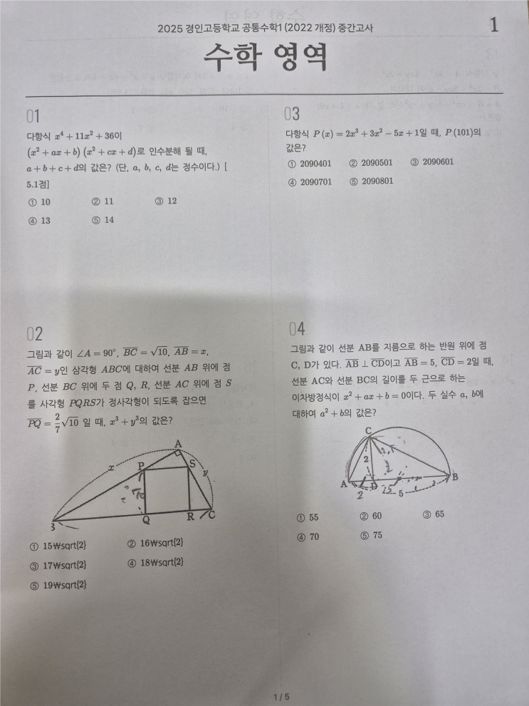 1️⃣ 우리 학교 ‘맞춤’ 내신 전략 수학 시험은 “운”이 아니라 “준비”의 결과입니다. 이지 영수 전문학원에서는 학교별 기출 분석과 밀착 관리로 아이들이 시험장에서 실력으로 승부를 볼 수 있게 돕습니다. “정확히 필요한 문제를, 딱 필요한 만큼” 풀게 합니다. 25년 1학년 1학기 중간 문제 학교 기출문제 유사문제 공통수학 1 (2022 개정) 문제 수18 문제 난이도 개념2문제/ 기본3문제 / 실력10문제/ 심화3문제 출제 유형 1.1.3 곱셈공식 실력2 1.1.4 곱셈공식의 변형: 기본1 1.2.2 나머지정리와 인수정리 기본1실력1 1.3.2 여러 가지 인수분해 실력1 1.3.3 인수정리를 이용한 인수분해 실력1 2.1.2 복소수의 사칙연산 기본1실력2 2.2....... <img src="https://blogthumb.pstatic.net/MjAyNjAzMDdfMTI1/MDAxNzcyODY5MTE3MTg1.vRGHvHBS0yRSFZ2dKbM4bZ5F4uknIVvM6RY4zlXX0xQg.aBMtbLaVdCO-Crv93ZyMa8gZACbz8Dnh2qs4aUeRgQYg.PNG/image.png?type=s3" />