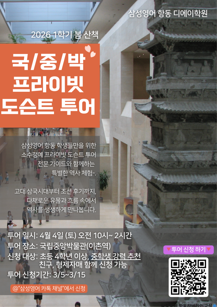 2026년 1학기 봄산책 ✔️국립중앙박물관 프라이빗 도슨트 투어 안내 안녕하세요. 아이들 배움에는 진심이고, 체험에는 누구보다 욕심 많은 삼성영어 항동 디에이학원 원장입니다 3년전쯤 우리 재원생 아이들과 함께 경복궁 답사를 하며 외국인에게 경복궁을 소개하는 영어영상을 찍었던 적이 있었는데요. 너무나도 유익했던/즐거웠던 23 경복궁 투어 약 30명 정도의 학생들의 아주 적극적인 참여속에 멋진 소개 영상까지 만들고, 맛난 점심까지 함께 먹으며 예쁜 추억 많이 만들었던 기억이 있어요. 그때 당시 무려 재원생의 절반이 참여했던!! 시작은 미약했지만 그 끝은 어마어마하게 커져버렸던(?) 터라 투어....... <img src="https://blogthumb.pstatic.net/MjAyNjAzMDJfOTMg/MDAxNzcyNDQ2Mjg1ODQw.EPmxE687KfXH3DBU6ps-Ze8kUvBsTkw48VW2ik4j2nAg.LccPdsJuwW0OJOlHXJmSanVOW0Rcg7d5pw4yZ9_1xmUg.PNG/%B1%B9%C1%DF%B9%DA_%C5%F5%BE%EE_%281%29.png?type=s3" />