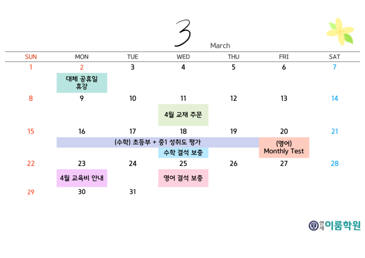 안녕하세요, 연세이룸학원입니다 :) 3월 새 학기가 시작되었는데요! 긴 겨울을 지나 맞이한 새 학기, 새로운 목표와 다짐을 가지고 한 해의 첫걸음을 내딛는 중요한 달입니다! 여러분의 힘찬 도약을 이룸학원이 함께 응원하겠습니다 2026년 3월 학사일정 안내드립니다. 궁금하신 사항은 언제든지 학원으로 문의 주세요 :) 연세이룸학원 02-2616-0507 010-7752-0509 [카카오톡 오픈채팅방] https://open.kakao.com/o/sDbHfi2g [인스타그램 주소] https://www.instagram.com/erum_academy/?igsh=MWt1eHFzcTZ2dHFl #구로구학원, #오류동학원, #오류1동학원, #오류2동학원, #연세이룸학원, #이룸학원, #초등학원, #중등학원, #고등학....... <img src="https://blogthumb.pstatic.net/MjAyNjAzMDNfMjk1/MDAxNzcyNTI0MDc3Mzgy.VqyU-S0D6YxTh8UHVGFlDxAlzAdQ11iwshUkDKw02Pcg.-lSOROckHkADzIm-ZtK4ZwqbYZKeo4qYzaIEh67X9log.PNG/2026_-03-%C7%D0%BB%E7%C0%CF%C1%A4-001.png?type=s3" />