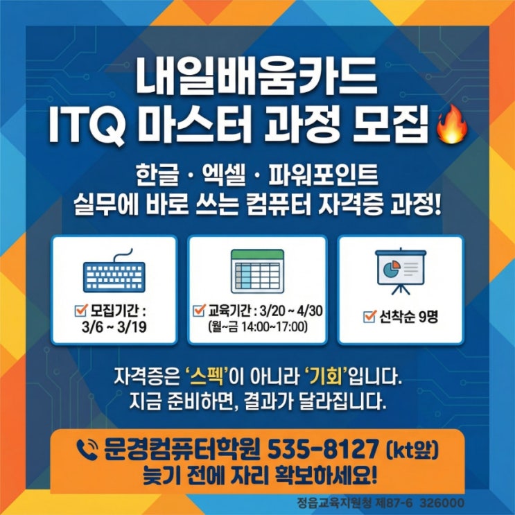 문경컴퓨터학원 국비 개강 내일배움카드 ITQ 마스터 과정 모집 한글 · 엑셀 · 파워포인트 실무에 바로 쓰는 컴퓨터 자격증(3개) 과정! ✔ 모집기간 : 3/6 ~ 3/27 ✔ 교육기간 : 3/20 ~ 4/30 (월~금 14:00~17:00) ✔ 선착순 9명 자격증은 ‘스펙’이 아니라 ‘기회’입니다. 지금 준비하면, 결과가 달라집니다. 문경컴퓨터학원 535-8127 (kt앞) 위지 정읍시 서부로71 kt앞 <img src="https://blogthumb.pstatic.net/MjAyNjAzMDZfMTI2/MDAxNzcyNzY4MjY5MDA5.p48Xszu-UU1bR6HaFjo3NPRWeOgBqQpjrN0BhqvNBPQg.CrF8rcVhmVaZ0ih7AFN67hhBDHTZSwHz9j2JtXZ6yScg.JPEG/900%A3%DF1772767185007.jpg?type=s3" />