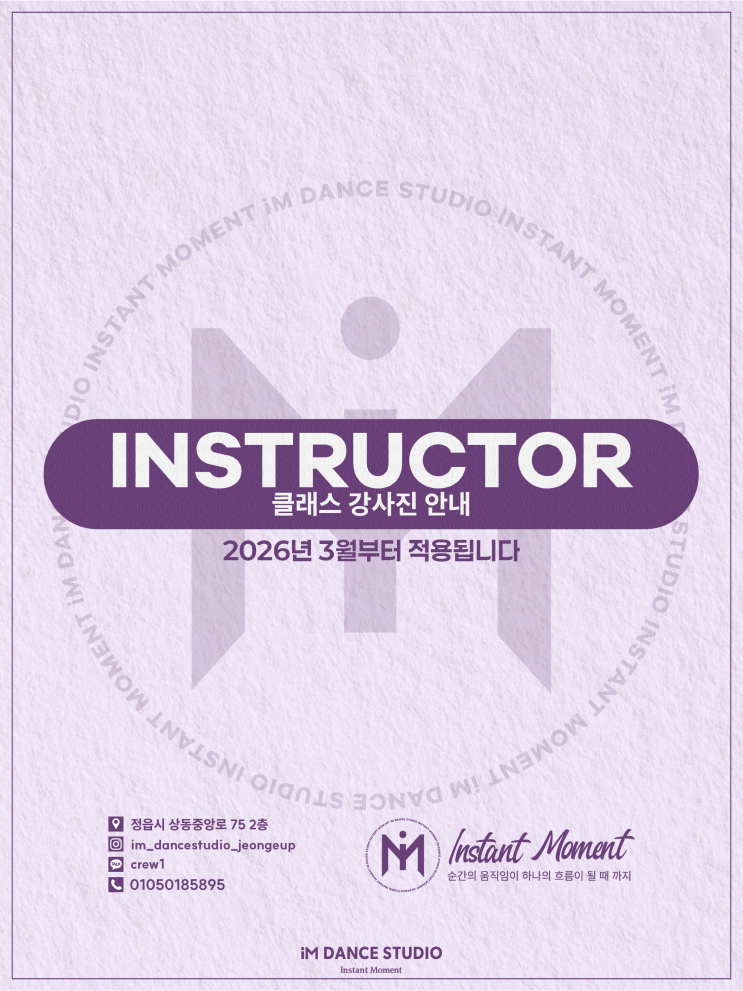 #전북댄스학원 #정읍댄스학원 #광주댄스학원 #전남댄스학원 #아이엠댄스스튜디오 #원장직강 #취미반 #키즈학생 #전문반 #성인반 아이엠댄스스튜디오 정읍점의 커리큘럼이 리뉴얼되었습니다↕️ 2026년 3월 1일부터 적용되며 구체적인 수강 문의는 DM, 전화, 방문 상담 등 편하신 방법으로 문의주시면 친절히 안내해드리겠습니다 아이엠댄스스튜디오는 ✔️전북 유일 스트릿댄스 걸스 파이터 등 방송매체 & 시 홍보영상 등 콘텐츠 출연 경력 다수 ✔️스트릿댄스 & 실용무용 전국 국제 경연 최신 경력 수상 다수 -의 경력을 가지신 강사님이 지도하시며 모든 커리큘럼에 동등한 고-품질의 수업을 들으실 수 있답니다!! 원장님이 직....... <img src="https://blogthumb.pstatic.net/MjAyNjAzMDZfMTYz/MDAxNzcyNzkwMTU5MzYz.SjOtNKiR7yFdvU4_BjaOVeidJCUpRnLpZr19u1Lxz0Mg.aLFx8-3DXnyq7JkDesomBkwFPtHuZCvSGYwjt41Tdh4g.PNG/1.png?type=s3" />