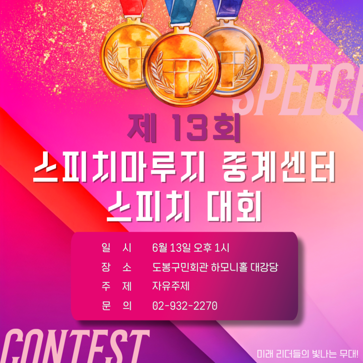 제13회 스피치마루지 중계센터 스피치대회 개최 안내 안녕하세요? 키즈스피치마루지 중계센터 입니다! 올해도 설레는 소식을 전해드립니다! 드디어 제13회 스피치마루지중계센터 스피치대회가 열립니다. 한 해 동안 갈고닦은 우리 아이들의 말하기 실력을 마음껏 펼칠 시간입니다. 이번 대회는 6월 13일 토요일 오후 1시 도봉구민회관 하모니홀 대강당 에서 진행됩니다. ▼ 대회 신청서 작성 ▼ 학원 강의실을 벗어나 넓은 무대, 조명, 그리고 많은 관객들 앞에 서는 경험. 그 순간만큼은 아이들은 그저 친구들 앞에서 ‘발표’를 하는 것이 아니라 스스로를 한 단계 뛰어넘는 도전을 하게 됩니다. 두근거리는 마음으로 무대....... <img src="https://blogthumb.pstatic.net/MjAyNjAzMDNfOTIg/MDAxNzcyNTMyMzU5Mzc3.5kPP9pc80XNqL1U20d4FijRnGbI6cFwvlg_kNgo8Zqwg.NS4b68CKfDyeAdVY3DNwcsVNAhUpj_ueSH6e4OpdsUEg.PNG/001.png?type=s3" />